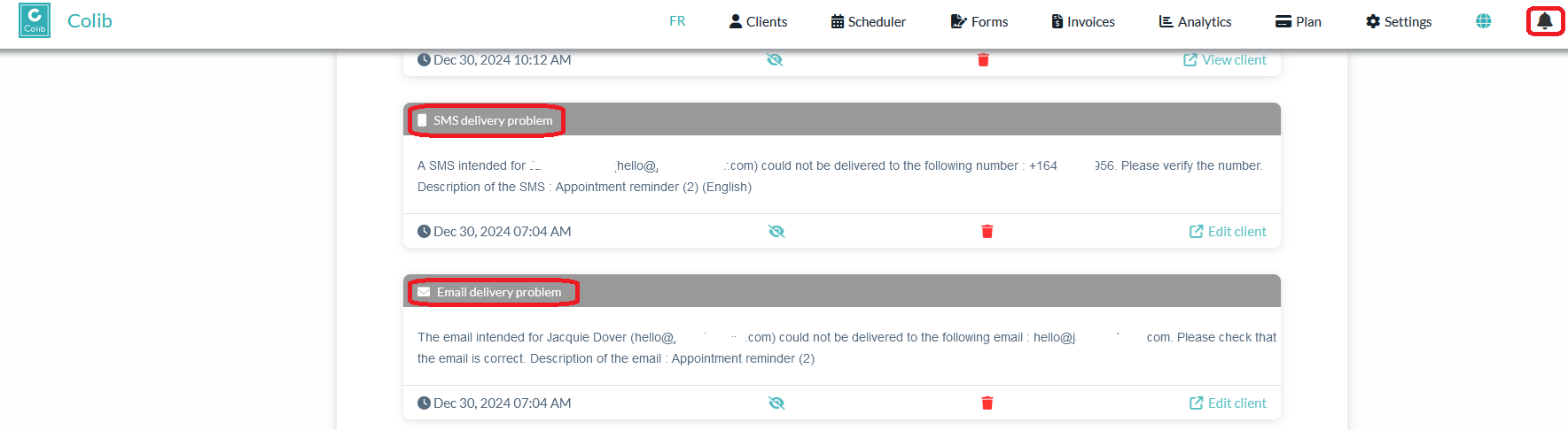 You will receive a notification whenever the delivery of an SMS or email fails for one of your clients.
