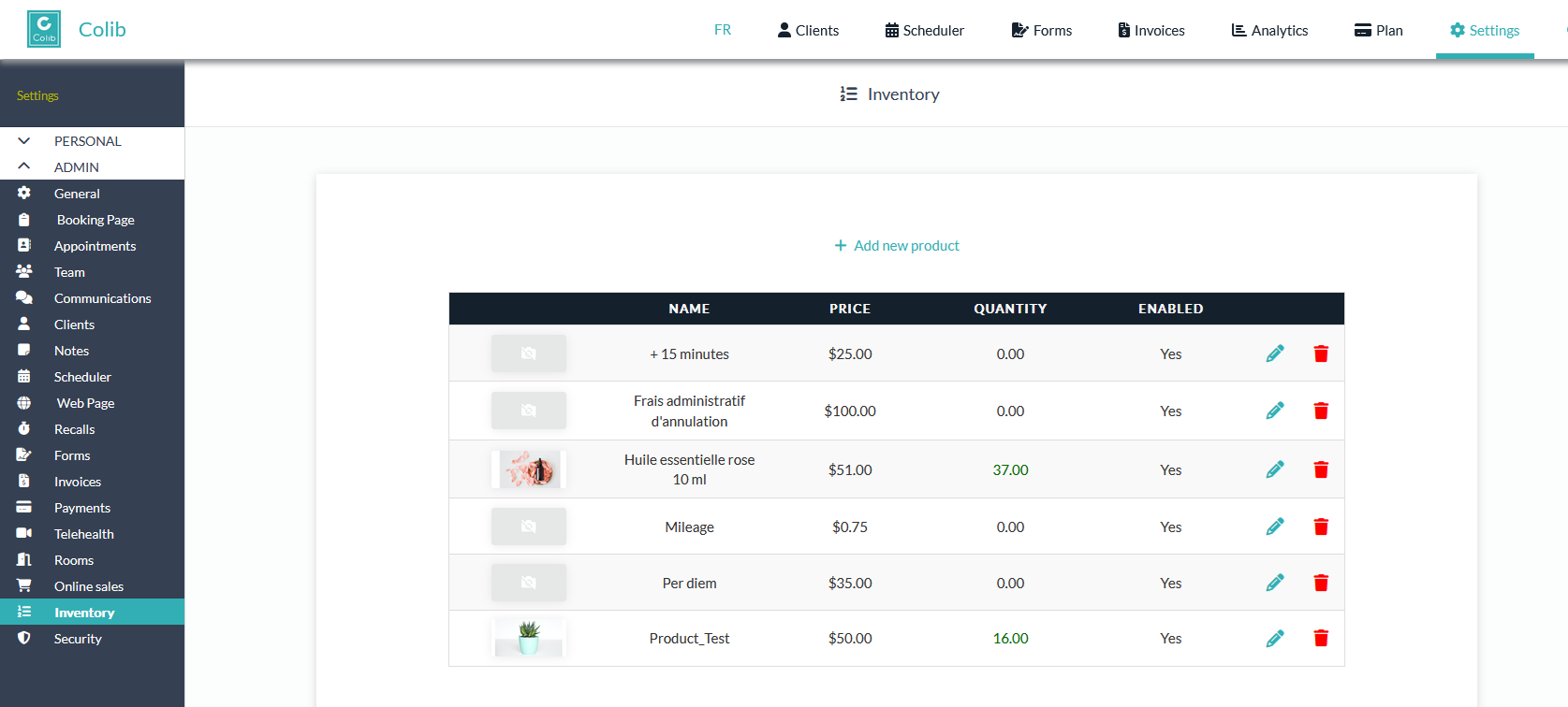 Add your products by clicking on the "+ Add new product" link. A modal will open, where you will need to enter the information for the product (price, description, picture, taxes, etc.).