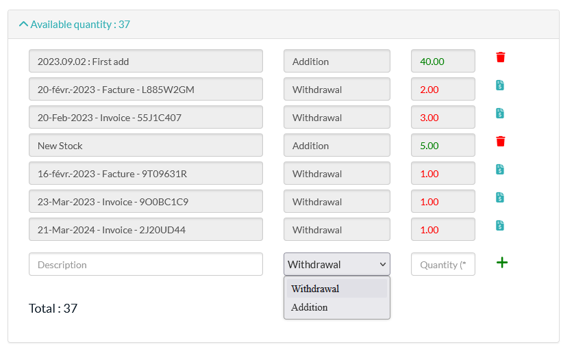 You will be able to see the stock balance for each product. Using a product on an invoice will automatically create a withdrawal entry in the stock management system. You can also manually create a stock withdrawal or addition for the product via the modal.
