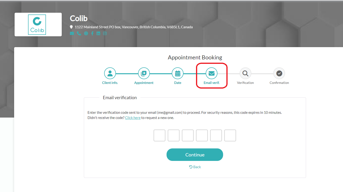 Once this option is enabled, a new step will be added to the booking process. Your client will need to enter a verification code sent to the email address they entered in the first step before continuing with the booking.