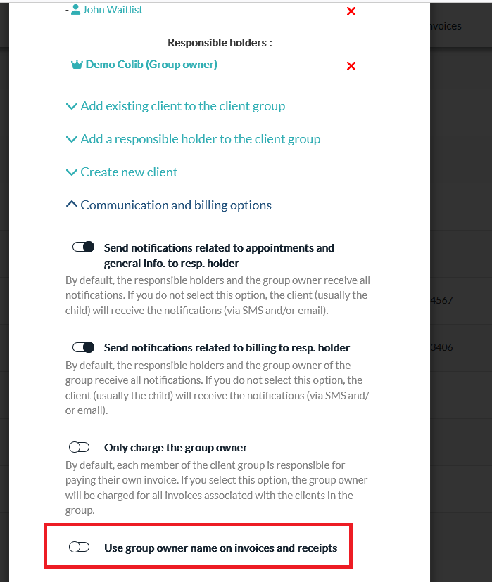 When this option is enabled, the group owner’s name (Client B) will automatically be added to the invoice for any invoice created for the group member (Client A).