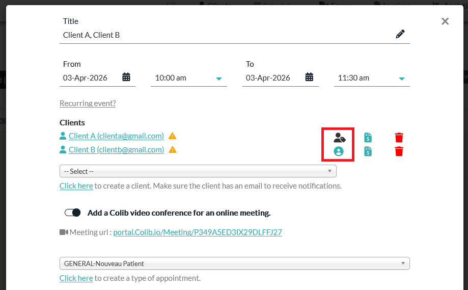 If several clients have been added to the appointment, for example in the case of couple therapy, you will need to choose which client will be charged or receive the invoice by email.