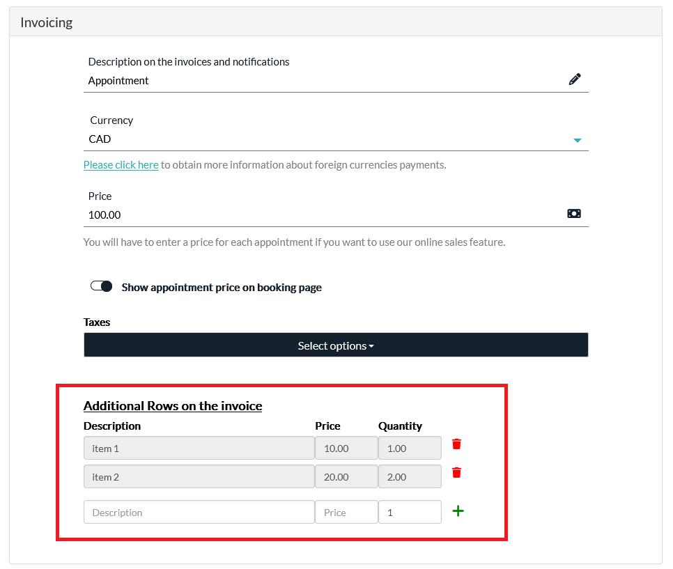 Every time an invoice is created for this type of appointment, these additional lines will automatically be added to the invoice.