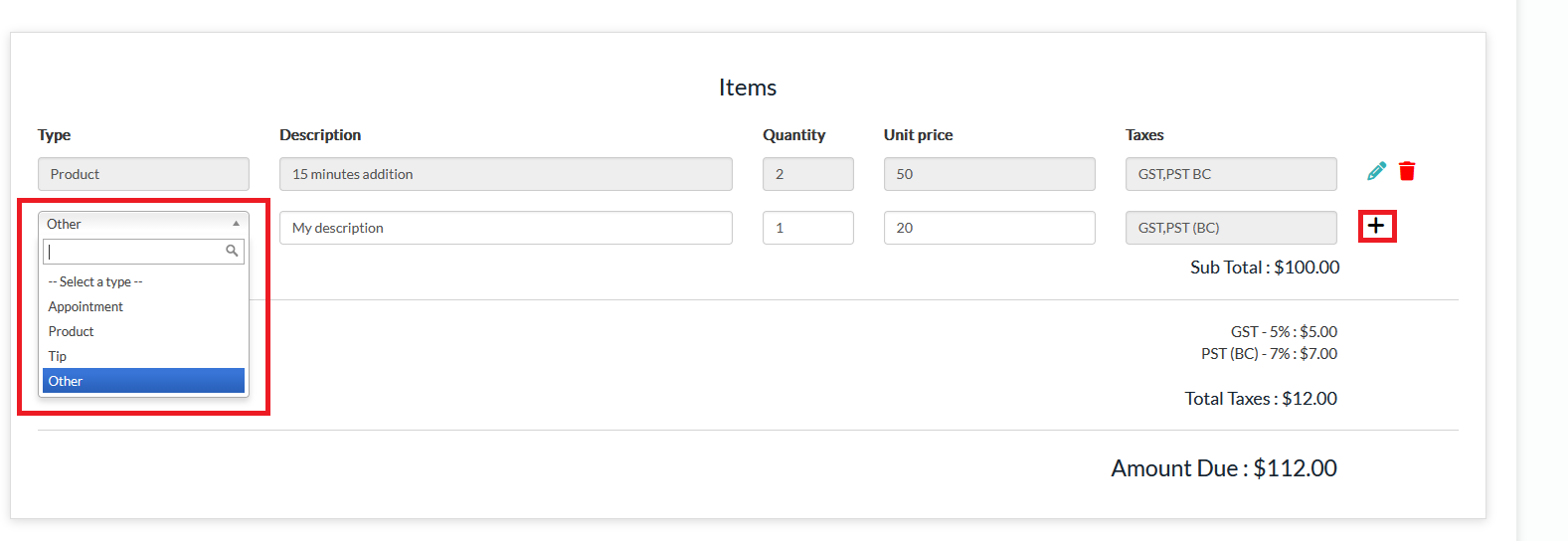 Do not forget to click on the “+” icon to add the new item to the invoice.