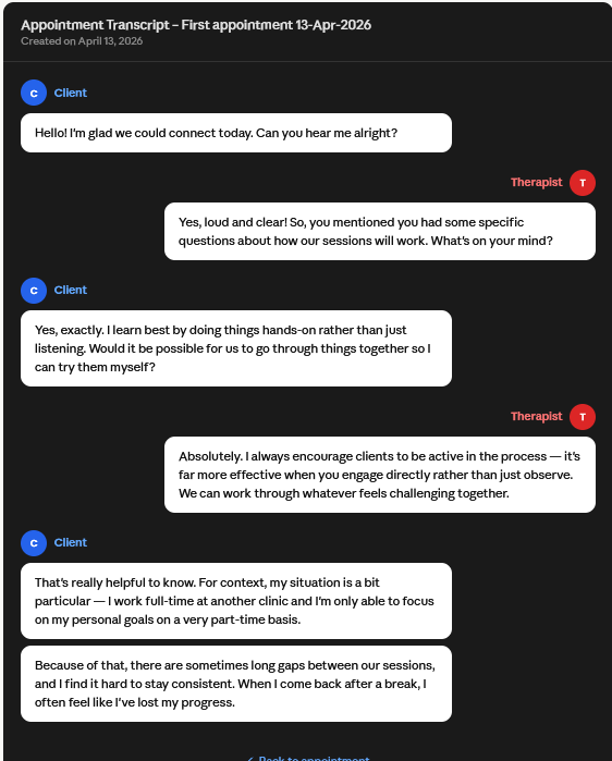 If you are using the Colib telehealth system, or if you generate AI session notes for in-person sessions with Colib, it is possible to save the transcript (the dialogue between the practitioner and the client(s) attending the session).