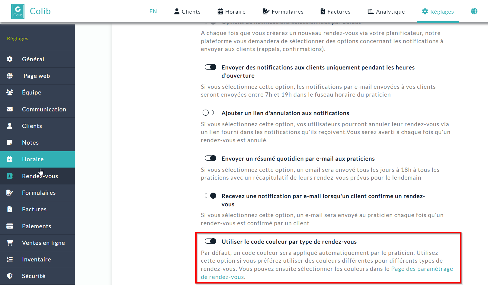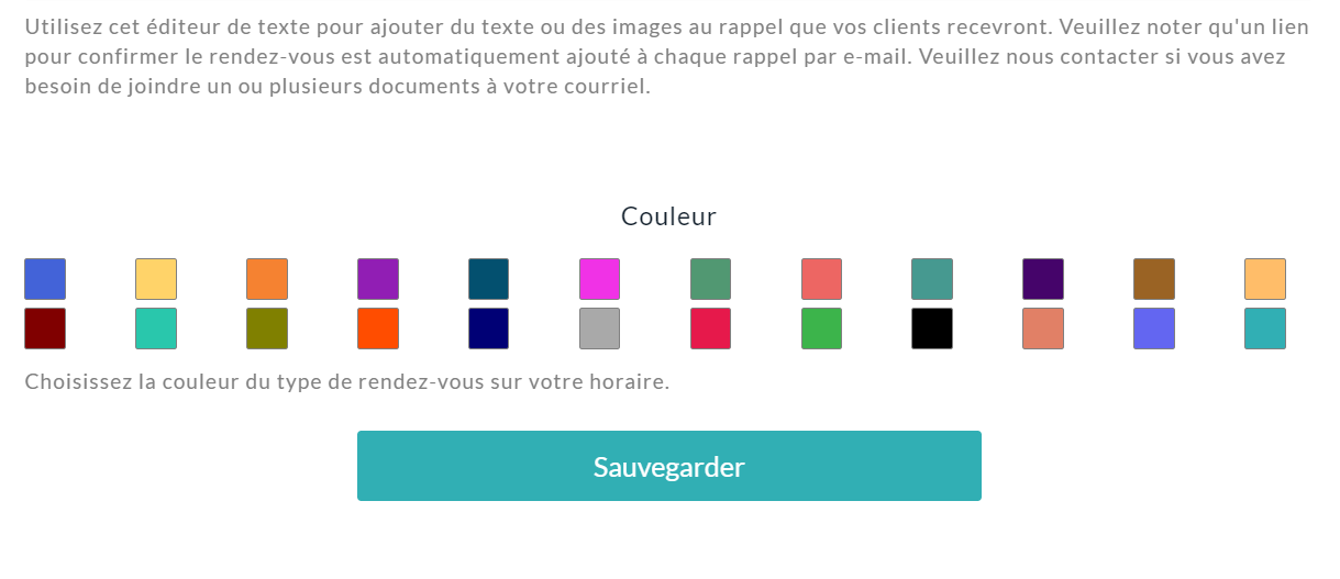 Une fois ce paramètre activé, vous pourrez sélectionner une couleur pour chaque type de rendez-vous.