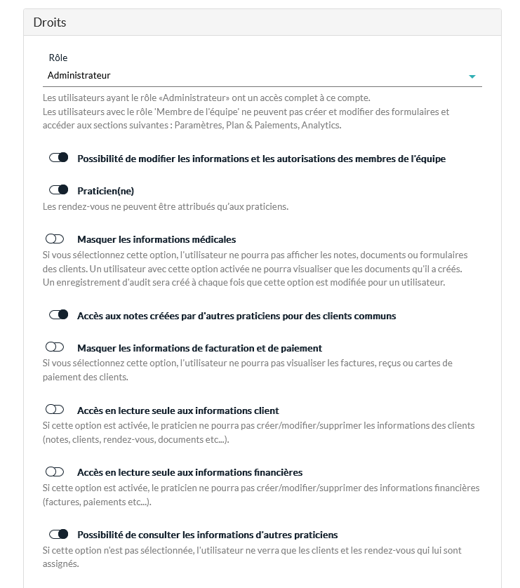 Lorsque vous créez ou modifiez un membre de l'équipe, vous devez définir les droits du membre de l'équipe dans la pratique.