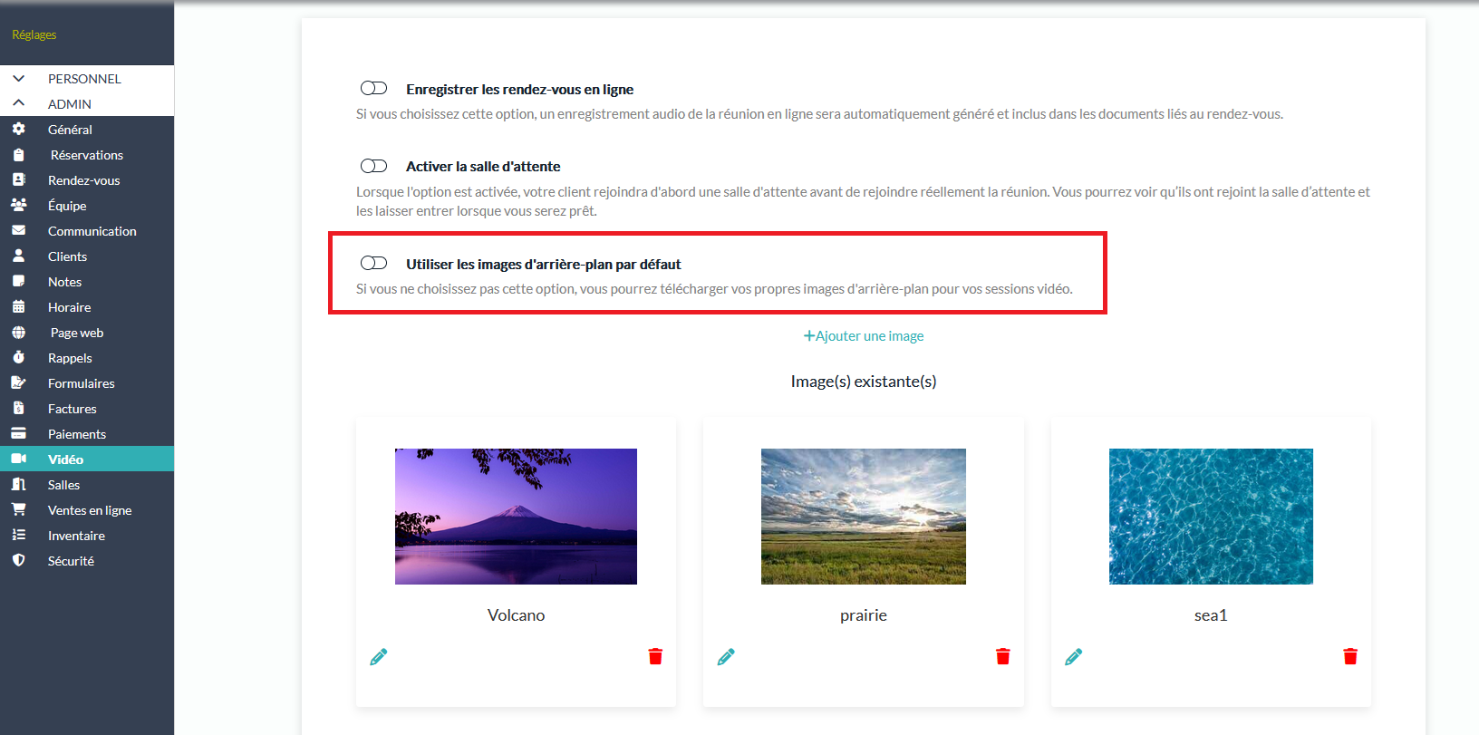 Les images de fond disponibles pour les sessions vidéo peuvent être personnalisées dans les paramètres de votre pratique. Il vous suffit de visiter le lien suivant pour effectuer des ajustements :