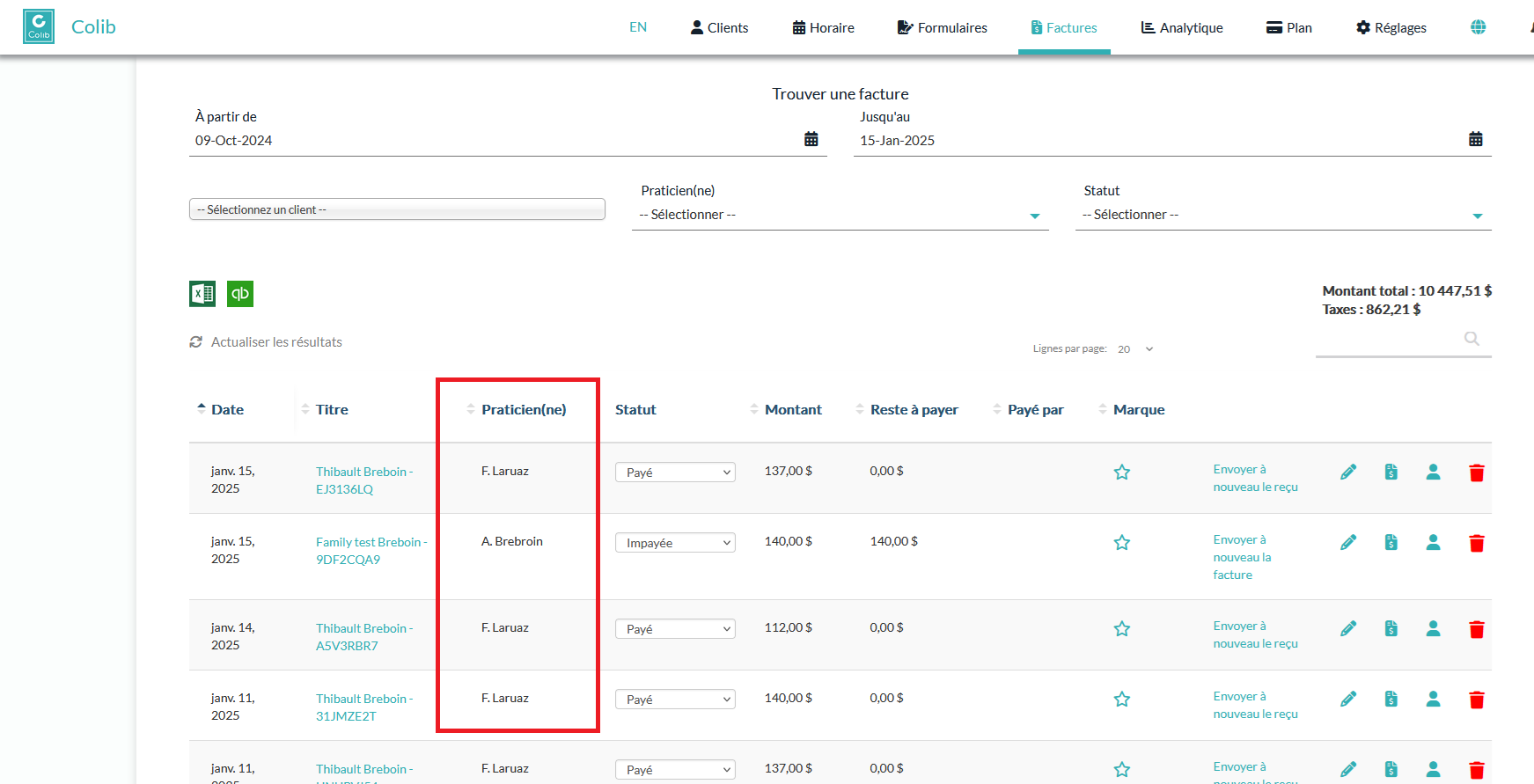 Pour chaque facture, Colib assigne un praticien. Si la facture est liée à un rendez-vous, le praticien assigné à ce rendez-vous sera également assigné à la facture. Si la facture n'est pas liée à un rendez-vous, Colib choisira le praticien en fonction de l'utilisateur qui a créé la facture. Si aucune de ces conditions ne s'applique, le praticien qui a créé la facture sera assigné.