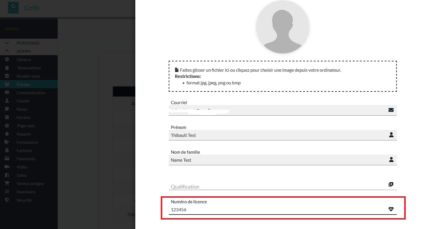 Assurez-vous que chaque praticien a son numéro de licence enregistré dans notre système. Ce numéro apparaîtra en haut à droite de la facture. https://www.colib.io/Settings?show=team