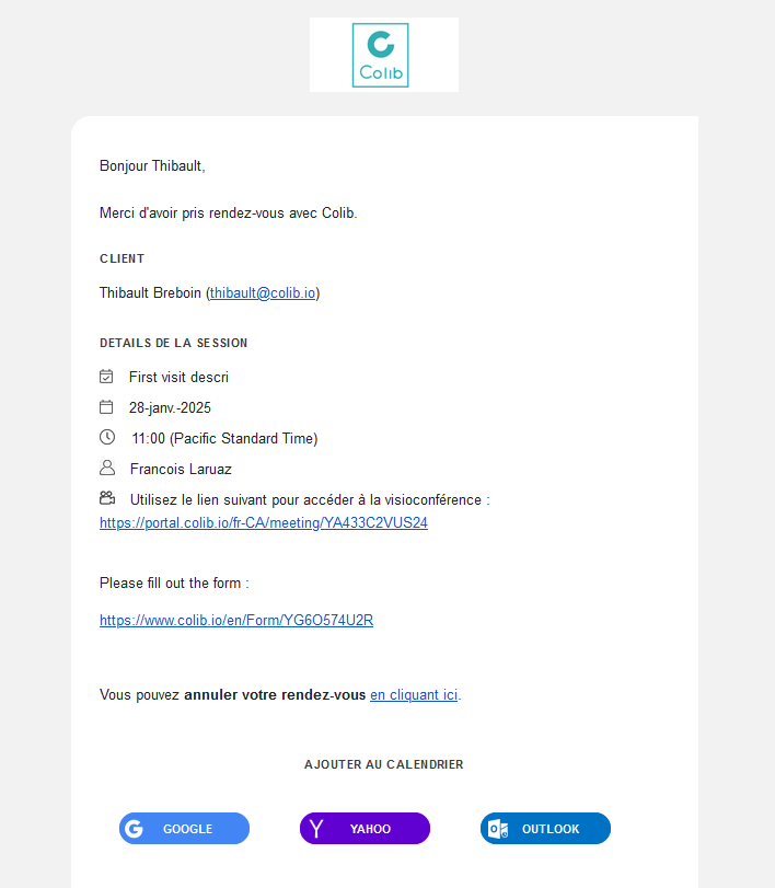 Colib automatise la communication avec vos clients en programmant automatiquement des e-mails de confirmation, des rappels et des relances, selon vos préférences. Voici comment le système fonctionne :