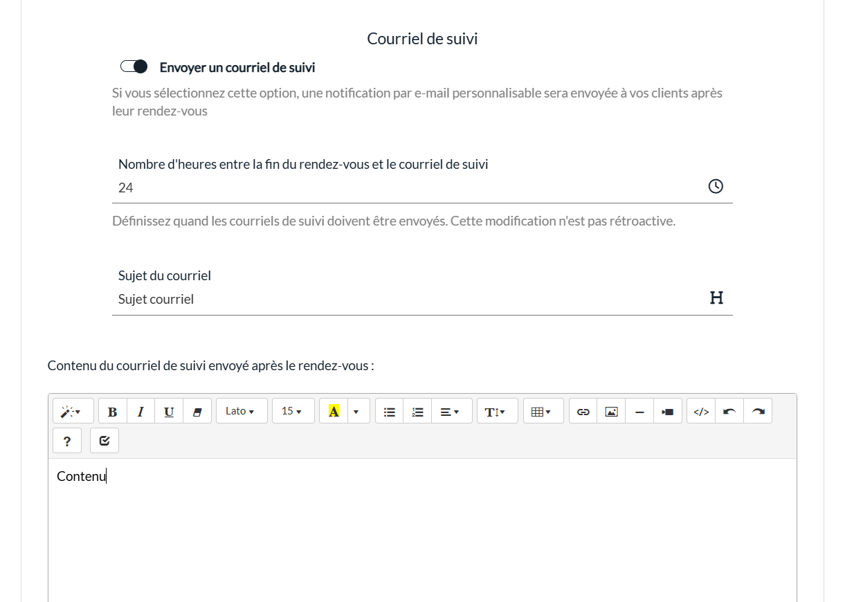 Vous pouvez personnaliser le contenu du courriel et définir le délai (en heures) entre la fin du rendez-vous et le courriel de suivi pour chaque type de rendez-vous.