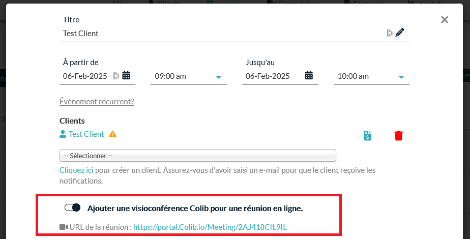 Si un type de rendez-vous n'a pas été configuré pour la téléconsultation, vous pouvez toujours ajouter un lien de vidéoconférence manuellement en activant l'option "Ajouter une vidéoconférence Colib pour une réunion en ligne" dans le modale du rendez-vous. Cela générera un lien de téléconsultation unique pour ce rendez-vous.