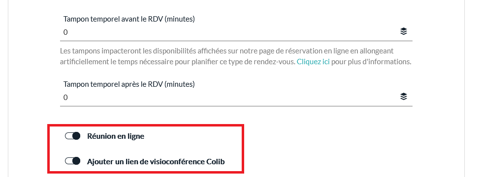 - Si vous souhaitez utiliser le système de téléconsultation de Colib, activez "Ajouter un lien de vidéoconférence Colib".