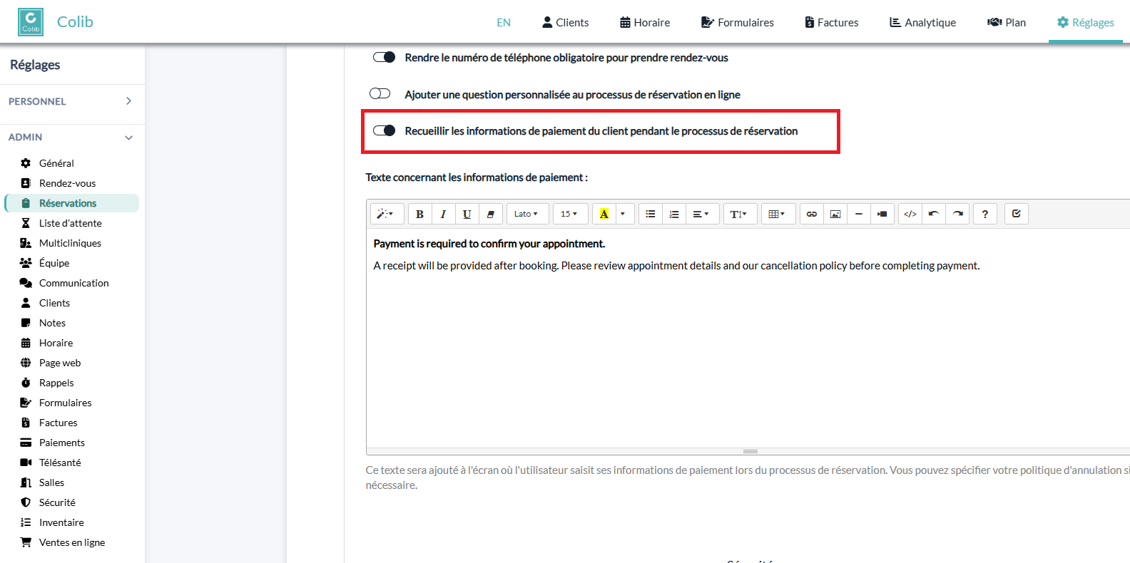 Vérifiez que « Réservation en ligne par le client » est sélectionnée comme type de réservation et que l’option « Recueillir les informations de paiement du client pendant le processus de réservation » est activée :