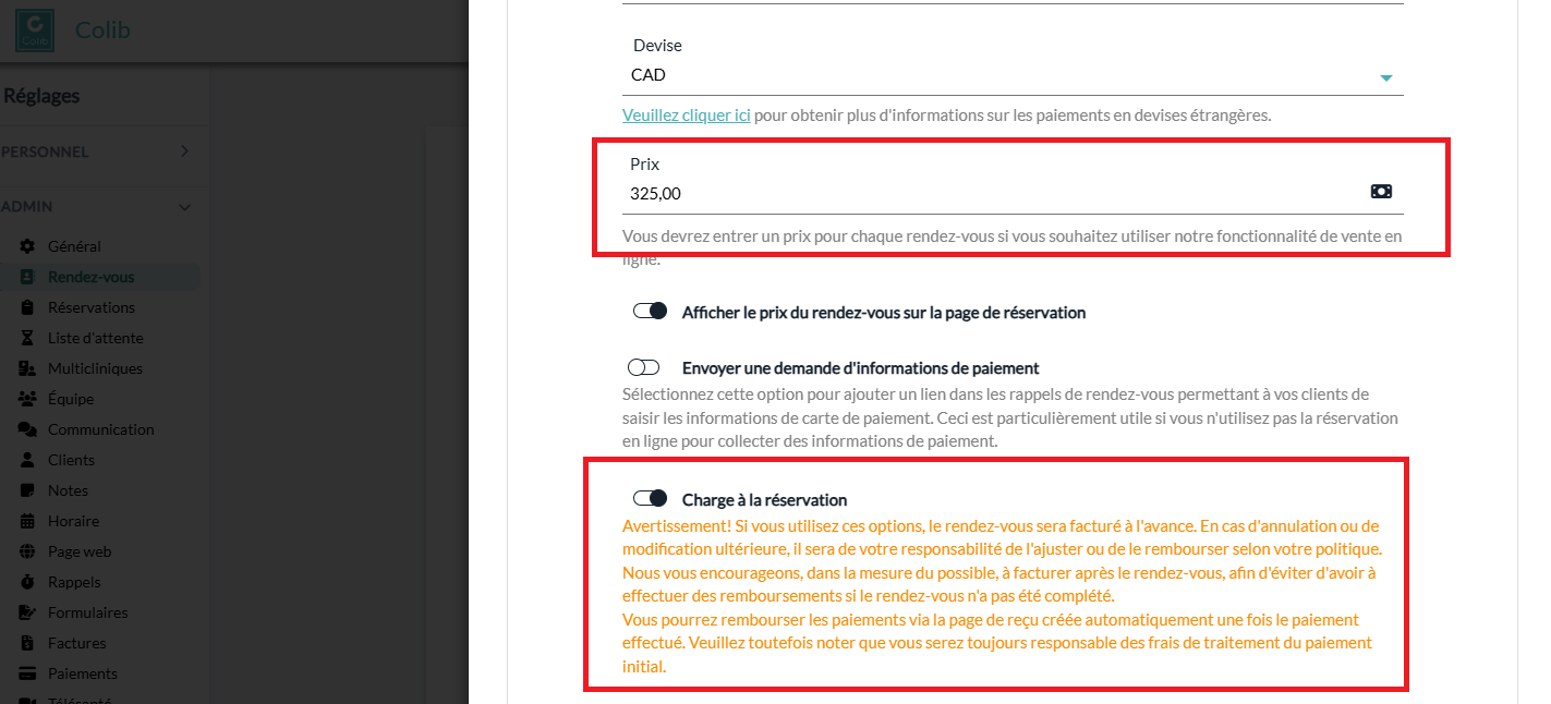 Assurez-vous que vos types de rendez-vous ont un prix défini et que l’option « Charger à la réservation » est activée pour tous les rendez-vous devant être facturés immédiatement après la réservation :