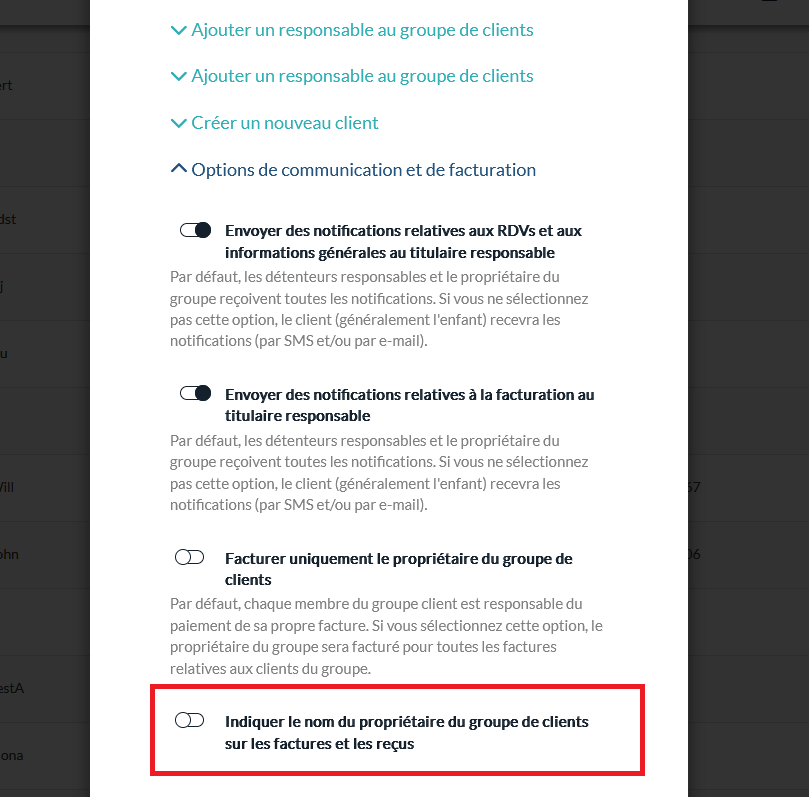 Lorsque cette option est activée, le nom du propriétaire du groupe (Client B) sera automatiquement ajouté à la facture pour toute facture créée pour le membre du groupe (Client A).