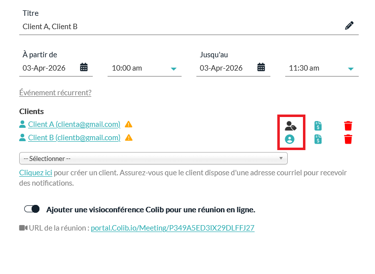 Le client avec l’icône bleu foncé est le payeur par défaut pour ce rendez-vous. En cliquant sur l’icône située dans la même colonne pour un autre client, vous pouvez définir ce client comme payeur par défaut du rendez-vous.